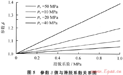 由圖5及式(10)可以看出:氣井無阻流量比值與滑脫系數(shù)(b)呈線性關(guān)系;滑脫系數(shù)(6)越大,供給邊界壓力(pe)越小,參數(shù)δ越大,氣體滑脫對氣井產(chǎn)氣能力影響越大;當(dāng)邊界壓力(pe)較低時(如pe≤5MPa),參數(shù)δ受滑脫系數(shù)(b)影響較大,氣體滑脫效應(yīng)對氣井產(chǎn)氣能力影響較大;而當(dāng)邊界壓力(pe)較大時(如pe≥10MPa),參數(shù)δ受滑脫系數(shù)(b)影響不大,氣體滑脫效應(yīng)對氣井產(chǎn)氣能力影響較小,這一計算結(jié)果與室內(nèi)巖心滲流實(shí)驗(yàn)結(jié)果一致。