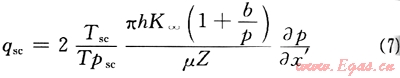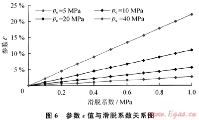 由圖6及式(11)可以看出:滑脫系數(shù)(b)越大,供給邊界壓力(pe)越小,參數(shù)ε越大,氣體滑脫對氣井生產(chǎn)影響越大;當(dāng)邊界壓力(pe)較低時(如pe≤5MPa),參數(shù)e受滑脫系數(shù)(b)影響較大,氣體滑脫效應(yīng)對氣井生產(chǎn)影響較大;而當(dāng)邊界壓力(pe)較大時(如pe≥10MPa),參數(shù)ε受滑脫系數(shù)(b)影響較小,氣體滑脫效應(yīng)對氣井生產(chǎn)影響較小,小于10%。這一計算結(jié)果與室內(nèi)巖心滲流實(shí)驗(yàn)結(jié)果也是完全一致的,說明低滲氣藏儲層滑脫效應(yīng)決定于孔隙壓力大小的結(jié)論是正確的。