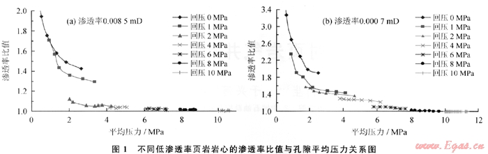 兩塊實(shí)驗(yàn)巖樣取自頁巖氣層,滲透率分別為0.0085mD和0.0007mD。實(shí)驗(yàn)過程中通過增加巖樣出口的回壓來模擬不同儲層孔隙壓力條件下氣體的滲流特征,回壓由初始的0.1MPa逐次增加到1MPa、2MPa、4MPa、6MPa、8MPa和10MPa,實(shí)驗(yàn)過程中計算并繪制不同回壓狀態(tài)下對應(yīng)的氣體滲流特征曲線 (圖1)??梢钥闯觯涸诘涂紫秹毫?小于1MPa)條件下,氣體在巖樣中的滑脫效應(yīng)顯著;隨著孔隙壓力增加,氣體在巖樣中的滑脫效應(yīng)明顯減弱,當(dāng)孔隙壓力達(dá)到6MPa時,氣體滑脫效應(yīng)引起的滲透率增加值已經(jīng)不足5%;當(dāng)孔隙壓力繼續(xù)增加到8MPa以上時,氣體滑脫效應(yīng)引起的滲透率增加值已經(jīng)小于1%,可見儲層孔隙壓力大小直接決定了氣體滲流過程中滑脫效應(yīng)的強(qiáng)弱,如果儲層孔隙壓力大于1OMPa,那么頁巖氣藏開發(fā)過程中就沒有必要考慮滑脫效應(yīng)對于氣井產(chǎn)能和生產(chǎn)壓力的影響。換算到地層條件下就是如果氣藏壓力系數(shù)等于1,那么深度大于1000m的氣藏開發(fā)就可以不必考慮滑脫效應(yīng)的影響;如果氣藏壓力系數(shù)等于0.5,那么深度大于2000m的氣藏開發(fā)就不受滑脫效應(yīng)的影響,但是對于1000m的氣藏,滑脫效應(yīng)對于氣藏的開發(fā)效果有一定的影響,這種影響對于產(chǎn)能極低的頁巖氣藏來講是不可忽視的。