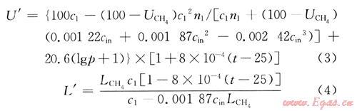 式中U′為特定溫度、壓力和組分下的爆炸上限,%;c1為氣相中甲烷的摩爾分?jǐn)?shù),且有cin=1-c1;以,為氧氣與單位摩爾的甲烷發(fā)生燃燒反應(yīng)時的摩爾數(shù);L′為特定溫度、壓力和組分下的爆炸下限,%。