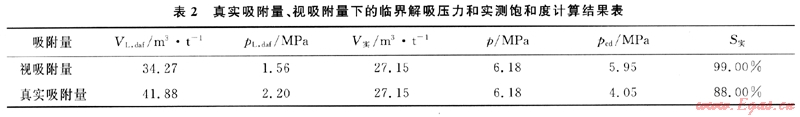 計算結(jié)果表明:真實吸附量情況下的臨界解吸壓力和實測飽和度要小于視吸附量情況下的臨界解吸壓力和實測飽和度,視吸附量情況下的臨界解吸壓力為5.95MPa,而真實吸附量情況下的臨界解吸壓力為4.05MPa,兩者相差1.90MPa。