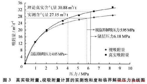 選取安陽礦區(qū)雙全井田-煤層氣參數(shù)井實測儲層參數(shù)及等溫吸附數(shù)據(jù),求取了真實吸附量和視吸附量下的吸附參數(shù),及由此推導(dǎo)出臨界解吸壓力和實測飽和度(表2、圖3)。等溫吸附實驗溫度為20℃,測試煤層為二1煤層。