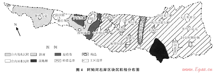 在阿姆河右岸地區(qū)西北部H2S含量普遍較高的背景下,有少量氣田H2S含量低,這些低H2S含量的氣田,正好位于開闊臺地深水沉積區(qū)(圖4),沉積物較細,類似于東南部高伽馬泥巖層,有較好的封隔性能,從而阻止了烴類和膏鹽巖的直接接觸,硫酸鹽熱化學(xué)還原反應(yīng)不能夠大量發(fā)生,造成H2S含量較低。