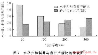 綜合分析氣井的物性參數(shù),建立不同井型的投入產(chǎn)出計(jì)算模型,明確不同井型的開采效果。圖2是采用普光氣田實(shí)際儲層參數(shù)計(jì)算的不同厚度氣層條件下斜井和水平井同直井的產(chǎn)能比,這里斜井井斜角取75°,水平井水平段長度取600m,氣層垂向滲透率與水平滲透率之比取0.5。從圖2中可看出,對有效厚度小于100m的氣層,水平井相對直井的增產(chǎn)效果明顯好于大斜度井,其增產(chǎn)倍數(shù)是斜井的2倍。但對于有效厚度大于200m的氣層,大斜度井的開發(fā)效果好于水平井。