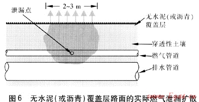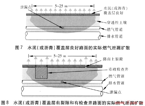 圖7為水泥(或瀝青)覆蓋層良好路面的實際燃氣泄漏擴散[6、7]。圖8為水泥(或瀝青)覆蓋層有裂隙和有檢查井路面的實際燃氣泄漏擴散[8]