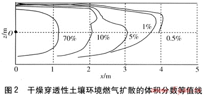 圖1為干燥天氣下穿透性土壤環(huán)境燃氣擴散的體積分數(shù)等值線。圖中原點0為泄漏點(以下各圖同)。