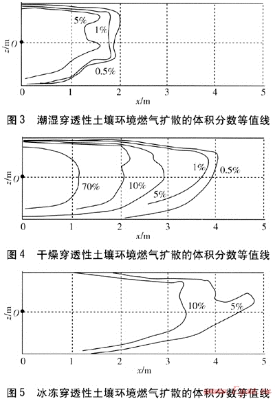 圖4為干燥穿透性土壤環(huán)境燃氣擴散的體積分數(shù)等值線,圖5為冰凍穿透性土壤環(huán)境燃氣擴散的體積分數(shù)等值線。