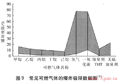 由于可燃氣體種類很多而性質(zhì)差異很大,為統(tǒng)一地描述其爆炸特性,通常采用爆炸極限這一參數(shù)。特別需要指出的是,某種可燃氣體的爆炸極限的值是通過實驗得到的客觀恒定值。圖9是常見可燃氣體的爆炸極限數(shù)據(jù)圖[9],表5是常見可燃氣體的爆炸極限數(shù)據(jù)表[9]