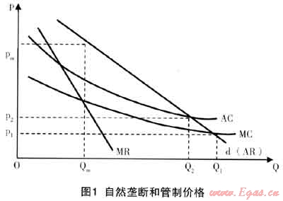 如圖1所示,其中,P表示價(jià)格,Q表示產(chǎn)量,d表示需求曲線。在市場(chǎng)上只有一家供貨者來(lái)說(shuō),市場(chǎng)需求曲線等于單個(gè)壟斷廠商所面臨的需求曲線。當(dāng)價(jià)格下降時(shí)(同時(shí)其他條件不變),市場(chǎng)上對(duì)產(chǎn)品的需求是增加的。在無(wú)管制的情況下,壟斷企業(yè)根據(jù)MR(邊際收益)=MC(邊際成本)的原則確定的產(chǎn)量為Qm,價(jià)格為Pm,價(jià)格顯然高于邊際成本,此時(shí)壟斷企業(yè)利潤(rùn)最大化。在政府管制的情況下,按照邊際成本定價(jià)法即P=MC,企業(yè)的價(jià)格下降為P1,產(chǎn)量增加為Q1。但隨之而來(lái)的問(wèn)題是,由于自然壟斷廠商是在AC曲線下降的規(guī)模經(jīng)濟(jì)段進(jìn)行生產(chǎn),所以,MC曲線位于AC曲線的下方。即是說(shuō),按照邊際成本MC所決定的價(jià)格P1一定小于平均成本AC。因此,在這種情況下,企業(yè)是虧損的,企業(yè)會(huì)退出生產(chǎn),或者犧牲必需的成本來(lái)降低平均成本,但會(huì)降低服務(wù)質(zhì)量。