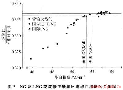 對華白指數(shù)限定范圍的控制是天然氣利用的安全性、環(huán)境排放和效率的保證。燃?xì)獾奶細(xì)浔葦?shù)決定了不完全燃燒指數(shù)的大小或燃燒的C0排放量。圖2給出了相對密度修正的碳?xì)浔群腿A白指數(shù)的關(guān)系。由此可見控制華白指數(shù)范圍與控制碳?xì)浔鹊淖兓粯?,具有限定不完全燃燒指?shù)或黃焰指數(shù)的同樣功效。圖2中GS(M)R是英國燃?xì)獍踩芾硪?guī)范“Gas Safety(Management)Regulations”的縮寫。