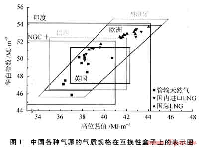 國內(nèi)在天然氣氣質(zhì)規(guī)格和互換性方面相關(guān)的標(biāo)準(zhǔn)主要有GB 17820—1999《天然氣》、GB/T 13611—2006《城鎮(zhèn)燃?xì)夥诸惡突咎匦浴?,以及與LNG相關(guān)的標(biāo)準(zhǔn)GB/T 19204—2003《液化天然氣的一般特性》、GB/T 11062—1998《天然氣發(fā)熱量、密度、相對密度和沃泊指數(shù)的計算方法》、GB/T 13610—2003《天然氣的組成分析氣相色譜法》。GB 17820主要參考了IS0 13686:1998《天然氣質(zhì)量指標(biāo)》,并根據(jù)含硫量的大小將我國商品天然氣分為3類,同時要求民用天然氣只適用一類和二類,三類可作為工業(yè)燃料。GB/T 19204—2003等同采用EN1160:1997《液化天然氣裝置和設(shè)備液化天然氣的一般特性》,在氣質(zhì)規(guī)格方面只對甲烷最低含量(75%)和氮氣最高含量(5%)進(jìn)行了限定。