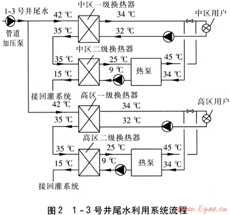 1~3號井尾水混合后的溫度約42℃,經(jīng)兩次換熱后回灌。中區(qū)與高區(qū)并聯(lián),均通過一級換熱器提供基礎(chǔ)負(fù)荷,不足部分負(fù)荷由熱泵提供。地?zé)崴毓鄿囟燃s15℃。