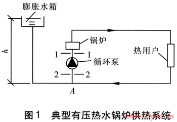 有壓熱水鍋爐是指鍋爐在運(yùn)行中承受壓力,承受的壓力等于循環(huán)泵揚(yáng)程與系統(tǒng)定壓點(diǎn)壓力之和,典型有壓熱水鍋爐供熱系統(tǒng)見圖1。由圖1可知,在有壓熱水鍋爐供熱系統(tǒng)中,循環(huán)泵位于回水干管的末端,點(diǎn)A是系統(tǒng)的定壓點(diǎn)。