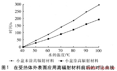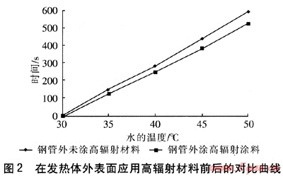 測試平臺如下:一個長600mm、寬600mm、高480mm的鐵皮箱,外表覆蓋保溫棉,內(nèi)部以石英加熱管作為熱源,在石英加熱管外部套上鋼管,鋼管受熱后,加熱旁邊的水杯。采用兩種測試方案,第一種方案是在鋼管外部涂刷高輻射材料,記錄杯中水的溫升隋況,另一種方案是鋼管外部不涂刷高輻射材料,杯內(nèi)放同樣質(zhì)量的水,記錄水的溫升情況。多次測量后,取平均值。在發(fā)熱體外表面應(yīng)用高輻射材料前后的對比曲線見圖2。