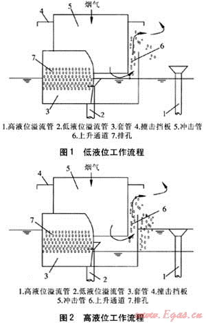 ① 雙液位噴射鼓泡煙氣脫硫除塵裝置適用于集中供熱鍋爐的煙氣脫硫除塵,當?shù)拓摵珊头饣馉顟B(tài)時,低液位溢流管能保證低液位與沖擊管出口處留有煙氣通道。