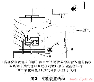 以石灰漿液為脫硫劑的雙液位噴射鼓泡煙氣脫硫除塵實驗裝置結構見圖3,模擬煙氣垂直進入沖擊管在出口處卷吸液體向上流動,此過程中煙氣被加濕冷卻,煙氣中的二氧化硫和煙塵與脫硫劑接觸被吸收和去除。經(jīng)除塵和脫硫后的煙氣轉向向上流動,在撞擊擋板作用下水霧被分離,凈化后的煙氣由引風機排出。脫硫劑循環(huán)泵將脫硫劑不斷補入塔內(nèi)以保證塔內(nèi)液位,正常工作時脫硫劑通過高液位溢流管進行循環(huán)。調(diào)整二氧化硫瓶的閥門,可以改變二氧化硫濃度,通過測壓管可以測得在不同煙氣流量下的裝置阻力。煙氣分析儀可以測出煙氣中二氧化硫濃度的瞬時值和積分值。實驗規(guī)模:模擬煙氣量200~1000m3/h,煙氣進口處二氧化硫質(zhì)量濃度700~850mg/m3,空塔流速1~3m/s。