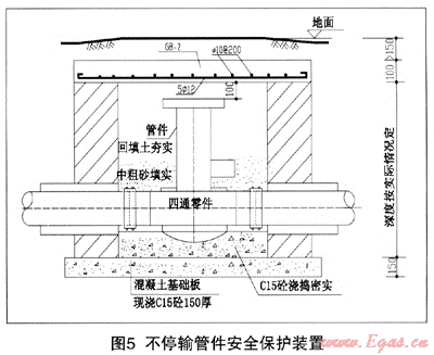 (1) 由于深圳市政燃氣管道埋深不一,不停輸設備只能在垂直于母管方向帶氣開孔、封堵,管件安裝后,約80%不能滿足規(guī)范要求,需采取保護措施解決;