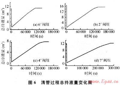 圖6顯示出了清管初始各閥組的總持液量為:11.1m3(6#閥組)、15.6m3(2#閥組)、7.8m3(4#閥組)、11.1m3(7#閥組)。清管后管線(xiàn)內(nèi)的總持液量為:1.6m3(6#閥組)、0.87m3(2#閥組)、0.5m3(4#閥組)、0.71m3(7#閥組)。初始總持液量是管線(xiàn)流體平穩(wěn)后的最大總持液量,而圖形中總持液量的最小值是各閥組經(jīng)過(guò)清管后的最小總持液量。清管完成后管線(xiàn)內(nèi)流體重新恢復(fù)穩(wěn)態(tài),總持液量又重新達(dá)到清管初始值。從圖6中曲線(xiàn)可以看出各閥組重新恢復(fù)穩(wěn)態(tài)的時(shí)間為:49.2h(6#閥組)、37.5h(2#閥組)、38.9h(4#閥組)、76.5h(7#閥組)。與穩(wěn)態(tài)計(jì)算結(jié)果相比較,TACITE瞬態(tài)計(jì)算清管重新恢復(fù)穩(wěn)態(tài)的時(shí)間要比穩(wěn)態(tài)大得多,這主要是因?yàn)門(mén)ACITE對(duì)組分變化的準(zhǔn)確瞬態(tài)跟蹤功能使計(jì)算結(jié)果更加嚴(yán)謹(jǐn)。