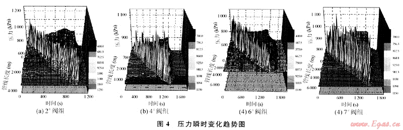 各閥組由于地形變化起伏大,壓力波動(dòng)隨著管線(xiàn)的起伏也發(fā)生了較大的變化(見(jiàn)圖4)。從圖中可以看到壓力波動(dòng)的位置出現(xiàn)在段塞出現(xiàn)處和管線(xiàn)走向發(fā)生改變的地方。在通球過(guò)程中各閥組流體壓力變化具有共同的特征:當(dāng)清管器放入管道后,由于清管器后部流體被阻,上游氣體被壓縮使清管器上游壓力急劇升高,清管器運(yùn)動(dòng)后,上游重新恢復(fù)到新的穩(wěn)態(tài);清管器下游由于流體連續(xù)性的中斷,開(kāi)始時(shí)下游流體壓力急劇下降,清管器經(jīng)過(guò)后,由于氣體得以補(bǔ)充,原下游下降的壓力開(kāi)始上升。清管器剛經(jīng)過(guò)時(shí),在清管器上游一定長(zhǎng)度的管段內(nèi)幾乎沒(méi)有液體存在,使清管器上游壓力幾乎相等,僅由于阻力損失使壓力出現(xiàn)微小的差別;當(dāng)清管操作完成后,各管段經(jīng)過(guò)一段時(shí)間重新達(dá)到了新的穩(wěn)態(tài)。