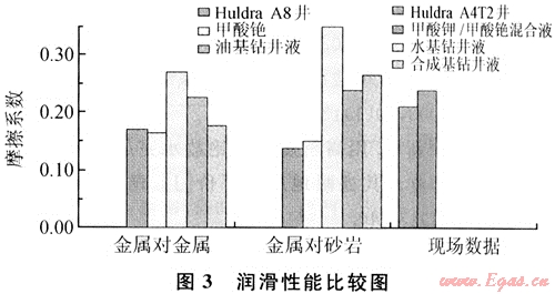 鉆井液的潤滑性已成為一個(gè)日益重要的因素。從實(shí)驗(yàn)研究結(jié)果(圖3)可看出,甲酸鹽鉆井液具有很好的潤滑性。