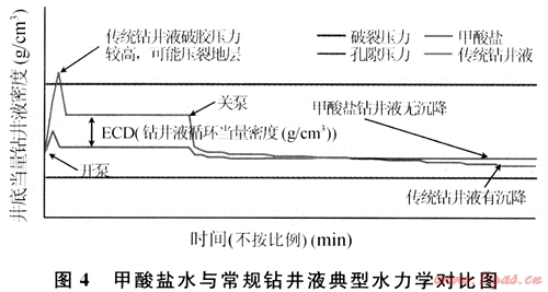 甲酸鹽鉆井液最大限度地降低了開泵時(shí)的瞬時(shí)峰壓、起下鉆時(shí)的抽汲激動(dòng)壓力和循環(huán)壓力損失。Huldra A4井和A4ST井的循環(huán)當(dāng)量密度比較見表5,甲酸鹽水鉆井液與常規(guī)鉆井液典型水力學(xué)對(duì)比(圖4)。