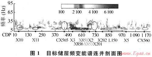 圖1所示是新場T511層頻變能譜連井剖面,重點關注的頻譜在橢圓區(qū)內。圖中顯示,在該儲層段內,獲得高產工業(yè)氣流的X10、X3、X856、X851、X853、X2、X202等井在低頻段(低于15Hz)具有較強的瞬時譜響應;獲得低產工業(yè)氣流的IA50、X5等井在低頻段(低于15Hz)具有相對較弱的瞬時譜響應;未獲工業(yè)氣流的干井X11、CX560井和產水的CX565、X201井在低頻段無強瞬時譜響應特征。