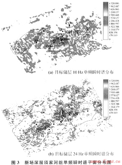 圖3所示是新場地區(qū)深層須家河組單頻瞬時譜平面分布情況,其顯示的瞬時譜具有十分明顯的差異。在圖3-a中,低頻強瞬時譜區(qū)域(紅色)包括了所有天然氣高產工業(yè)井,低產井分布在低頻弱瞬時譜區(qū)域(淺藍色),水井分布區(qū)域低頻瞬時譜更弱(白色)。在圖3-b中的多邊形框內,高頻強瞬時譜是泥巖響應,而高頻弱瞬時譜是有效砂巖儲層響應。雖然,含氣儲層和含水儲層在高頻段有相似的響應特征,但是,結合已知井信息,將圖3-a與圖3-b進行仔細對比,就可以發(fā)現(xiàn)含氣儲層和含水儲層具有不同的時頻響應規(guī)律。