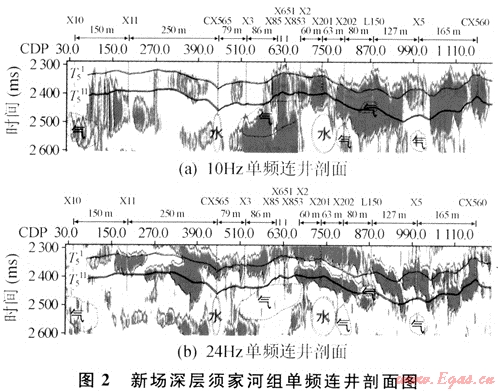 地震波在含氣儲層和含水儲層中傳播時,振幅、頻率和能量等動力學屬性將會發(fā)生變化。但是,兩者的變化程度可能存在差異,且在時間域內卻很可能難以發(fā)現(xiàn)。時頻分析技術可以將時間域的地震信號變換到時間-頻率域進行解釋,在時間-頻率域內突出含氣儲層和含水儲層之間的地震響應差異。將該方法應用到川西坳陷深層須家河組氣藏的含氣性檢測中,在時頻域內利用“低頻陰影”、“高頻衰減”等含氣響應特征,對含氣儲層和含水儲層進行了有效區(qū)分。