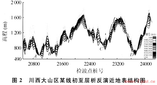 圖2中低速帶速度介于1500~2550m/s之間,降速帶速度超過3900m/s,厚度橫向變化大,稱之為典型的近代塔式風(fēng)化模式。多少萬年前形成嚴(yán)重的切割地形,受大自然風(fēng)化作用,不同部位風(fēng)化程度不同,最尖銳的山尖部位,明顯剝蝕得快些,速度低且厚度大。隨著深度的增加,等速度面速度越來越高,而橫向上高程的變化越來越平緩。