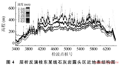 依據(jù)層析反演的近地表速度模型用手工拾取出一個高速層頂面作為近地表結(jié)構(gòu)的底界面,這種方法的不足之處在于不同測線之間有可能造成較大的閉合差,所以要小心拾取,或者回過頭來修改之。