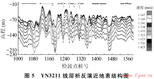 在利用初至波層析反演方法中,最大炮檢距可控制層析測量深度。通過調(diào)節(jié)最大炮檢距可獲得反演測線近地表結(jié)構(gòu)的底界面。在該界面上速度橫向變化比較小、層厚度橫向變化也比較小。這可以說明,在該炮檢距下層析所測近地表結(jié)構(gòu)已經(jīng)接觸到了其下的高速巖層,而且,該界面以下地層對靜校正量已沒有影響、或影響很小。圖2即是用這種方法所獲得的近地表結(jié)構(gòu)。實(shí)踐表明,同一地區(qū)二維測線層析反演時,用同一最大炮檢距所計(jì)算的靜校正量,各測線是相互閉合的。