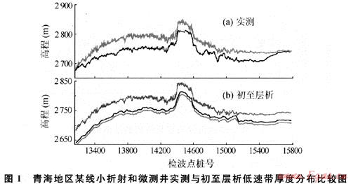 該例子比較典型,因?yàn)樵搮^(qū)低速帶與降速層分界面很清楚,速度差異比較大。無論用小折射測量、微測井測量還是初至波層析反演,不同操作人員的解釋,其速度分層結(jié)果會基本一致。而通常情況下,當(dāng)?shù)?、降速帶縱向上速度變化梯度復(fù)雜時,小折射法、微測井法、層析方法會因?yàn)槿藗兊恼J(rèn)識和分層方式不同,其分層結(jié)果出現(xiàn)多解性。