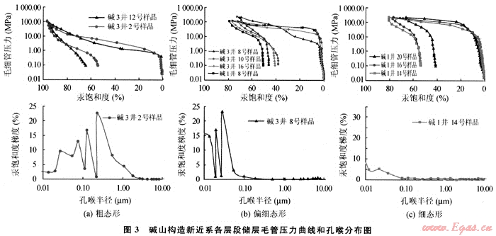 儲(chǔ)層孔隙結(jié)構(gòu)分為粗態(tài)型、偏細(xì)態(tài)型和細(xì)態(tài)型3種類型,整體排驅(qū)壓力較高(圖3),儲(chǔ)層主要流動(dòng)喉道半徑較小,喉道孔徑主要分布在小于0.1μm的范圍,屬小孔-微細(xì)喉型,喉道系統(tǒng)較復(fù)雜,均勻程度差,分選不好,孔喉比大,喉道相當(dāng)彎曲,因而排驅(qū)壓力和飽和度中值壓力高,退出效率低,充分表明儲(chǔ)層孔隙結(jié)構(gòu)差,故儲(chǔ)層滲透能力差,為差儲(chǔ)集層,不利于油氣的運(yùn)聚。從縱向上整體來看滲流能力由上向下逐漸變差(表2)。根據(jù)裘亦楠、王允誠等確定的砂巖儲(chǔ)層分類評(píng)價(jià)方案所示,表明堿山構(gòu)造各儲(chǔ)層屬Ⅱ3-Ⅳ類儲(chǔ)層,即中下等到很差-差類儲(chǔ)層,這也是該區(qū)沒有形成規(guī)模聚集的主要原因之一[8~9]。