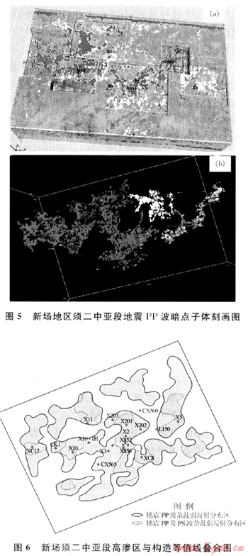 圖5-a為通過基于小波變換的多尺度吸收增強處理后不同暗點子體在不同時窗上的可視化立體顯示圖[14],可以看出,宏觀上須二段中部存在5~6個吸收異常子體,各子體存在于不同的時間段(或深度范圍),圖5-b為利用像素成像技術(shù)Texture屬性對暗點進行的空間可視化刻畫圖,雜亂反射得以清晰刻畫。