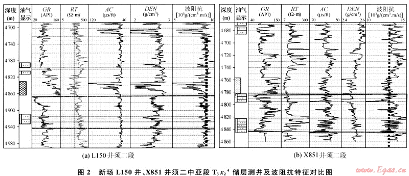 儲層與圍巖波阻抗差的大小決定地震反射強度,因而波阻抗特征是高效儲滲體識別的重要線索。由于波阻抗為速度與密度的乘積,因此,可根據(jù)測井聲波時差A(yù)C和密度DEN測井資料,換算出波阻抗值。通常,根據(jù)儲層與圍巖波阻抗的相對差異,可將儲層波阻抗特征分為3類[9~10]:Ⅱ類:高波阻抗,儲層波阻抗明顯高于圍巖;Ⅱ類:中等波阻抗,儲層波阻抗近于圍巖;Ⅲ類:低波阻抗,儲層阻抗明顯低于圍巖。前述須二段儲滲體中儲層波阻抗特征主要表現(xiàn)為以下兩類: