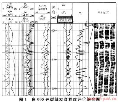 將上述評價裂縫發(fā)育程度指標(biāo)的計算模型和參考文獻(xiàn)[1]所述巖石力學(xué)動靜態(tài)轉(zhuǎn)換關(guān)系式編制成Fortran語言,掛接在Forward測井解釋平臺上,實現(xiàn)單井逐點(diǎn)可視化處理。對工區(qū)內(nèi)10多口具有成像測井資料和巖心描述的井進(jìn)行了裂縫發(fā)育程度指標(biāo)處理,圖1為白005井裂縫發(fā)育程度評價綜合成果圖。由圖1不難發(fā)現(xiàn),630~652m井段,完整性系數(shù)值較低、裂縫發(fā)育程度指標(biāo)值較高、巖石穩(wěn)定系數(shù)值偏低,從所對應(yīng)的成像測井圖上可以看出,該段斜交縫和網(wǎng)狀縫較為發(fā)育,巖心描述為半充填的低角度和網(wǎng)狀縫。從工區(qū)內(nèi)其他井的處理情況來看,處理結(jié)果與成像測井和巖心描述對應(yīng)性都較好。因此,筆者所述方法對研究工區(qū)火山巖裂縫發(fā)育程度評價較為有效。