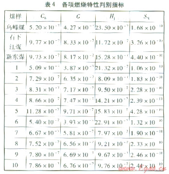 可燃性指數(shù)Cb主要反映煤樣燃燒前期的反應能力,該值越大,表明可燃性越好。各煤樣的可燃性指數(shù)Cb見表4。由表4可知,單煤樣中,石下江煤、新東煤的可燃性較好,烏峰煤的可燃性較差?;烀旱目扇夹曰窘橛趦煞N單煤的可燃性之間,且隨著某種單煤比例的增加,混煤的可燃性指數(shù)Cb逐漸向該煤種靠近。烏峰煤與石下江煤按2:8摻混時,混煤的可燃性明顯變好。