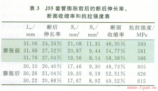 套管在膨脹后,徑向增大幅度可以叫做膨脹的變形程度,也叫做膨脹率。本試驗中,l號、2號J55套管的膨脹率分別為9.9,8%、9.37%。