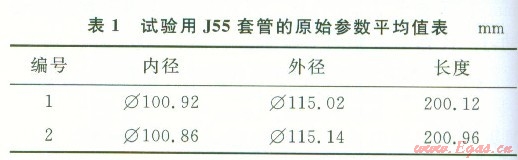 試驗中使用APl標準的J55套管(Φ=ll4.30mm,壁厚6.88 mm),其化學成分(質(zhì)量分數(shù),%)為:0.35C,0.31Si,1.39Mn,0.017Ni,0.092M0,0.19Cr,0.004S,0.014P,對兩段套管的實測原始參數(shù)如表1所示。