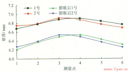 膨脹后套管的壁厚不均度會影響管材的使用性能,所以對膨脹前后管材的壁厚不均度都應該嚴格控制。APl規(guī)定套管的壁厚不均度標準在12.5%以下,而管材冷加工的經(jīng)驗標準為8%【5】,應該以冷加工經(jīng)驗作為膨脹管壁厚不均度的標準。
