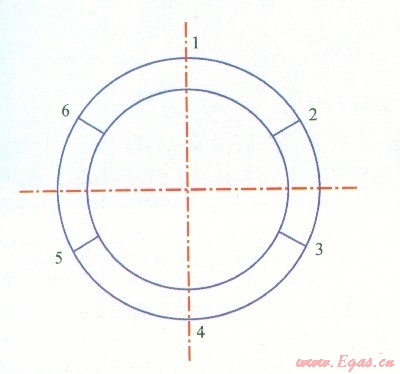 采用定點測量的方法(如圖2所示),即在j55套管端面選擇6個點,分別測量并記錄膨脹前的壁厚值,待膨脹后依然只測量打標記的6個點的壁厚值。