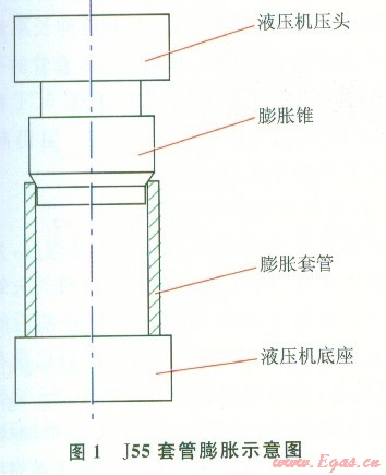 本試驗選用模具鋼Crl2MoV作為膨脹錐的材料,自主設計并加工膨脹錐用于J55套管的膨脹。試驗采用自上而下的膨脹方式,通過YQ41單臂液壓機完成J55套管的膨脹,如圖l所示,液壓機的底座固定,壓頭向下施加與膨脹套管軸向一致的載荷,膨脹錐在導向區(qū)段的引導下緩慢進入套管,套管在巨大的接觸應力下開始膨脹。在膨脹試驗前,對2號套管進行潤滑處理,1號套管則沒有,只清除管壁內(nèi)的雜質(zhì)。