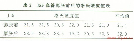 說明外徑的變化比例要小于壁厚的變化比例,即不均勻變形程度越小。據(jù)計算,1號、2號套管膨脹后的Q值分別為0.88、0.89,即l號套管的不均勻變形程度稍大于2號套管,也可以說明適當?shù)臐櫥怯兄谔坠茉谂蛎涍^程中的均勻變形。2.3洛氏硬度值的變化及原因