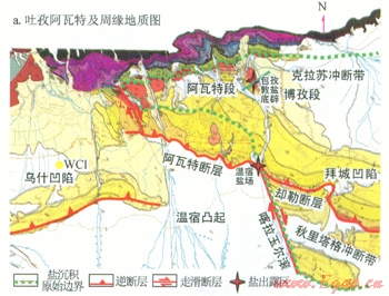 阿瓦特段北起北部構(gòu)造帶,向南推覆到溫宿凸起之上,形成阿瓦特膏鹽巖推覆體。