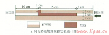 在水平面上。基底石英砂厚度2 cm,模擬實(shí)際基底地層4 km,硅膠厚度1 cm,模擬實(shí)際鹽層厚度2 km。該實(shí)驗(yàn)基底無滑脫層,用石英砂模擬硬性地層,用硅膠模擬鹽巖(圖3-a)。