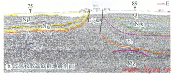 在鹽的滑脫作用下,鹽上層變形與鹽下層變形不協(xié)調(diào)。鹽上層主要表現(xiàn)為幅度很小的向斜盆地和推覆距離很大的逆沖推覆體,鹽下前緣斷層在擠壓作用下即開始形成,直至擠壓最終結(jié)束,始終在活動。而鹽上負(fù)載則在鹽的滑脫作用下推覆至鹽盆地南邊的硬性地層之上,并由于鹽的聚集作用和基底的抬升作用,鹽上
