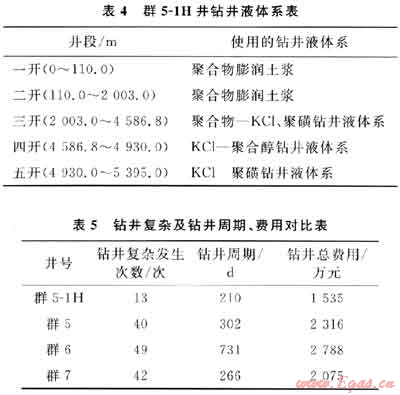 群5-1H井鉆井技術(shù)難度主要表現(xiàn)為:三開后,隨著裸眼段的延長,容易發(fā)生井壁坍塌。同時,由于鉆井液密度的提高,容易引起鉆井液中有害固相增加,造成鉆具遇卡和下套管遇阻。為此,對該井采用了分井段鉆井液技術(shù)設(shè)計(表4)。