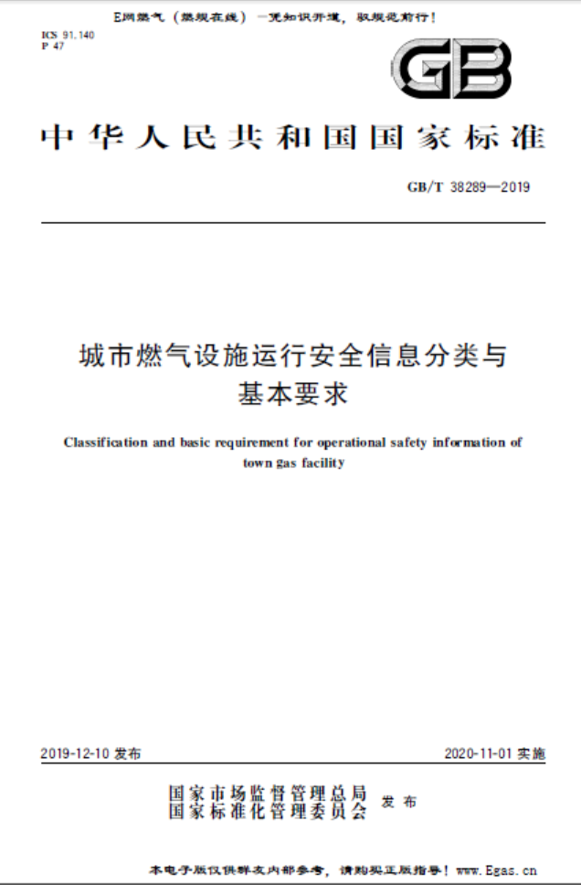 城市燃?xì)庠O(shè)施運(yùn)行安全信息分類與基本要求GB∕T 38289-2019 本標(biāo)準(zhǔn)規(guī)定了城市燃?xì)庠O(shè)施運(yùn)行安全信息的術(shù)語和定義.基本原則,分類和基本要求。