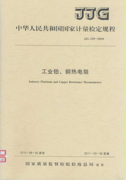 工業(yè)鉑、銅熱電阻檢定規(guī)程JJG 229-2010:本規(guī)程適用于-200℃~+850℃整個或部分溫度范圍使用的溫度系數(shù)α 標(biāo)稱值為3.851×10-3℃-1的工業(yè)鉑熱電阻和-200 ℃~+850 ℃整個或部分溫度范圍使用的溫度系數(shù)α 標(biāo)稱值為4.280×10-3℃-1的工業(yè)銅熱電阻的首次檢定、后續(xù)檢定和使用中檢驗(yàn)。