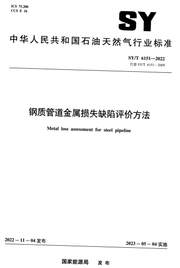 SY/T 6151-2022 鋼質管道金屬損失缺陷評價方法:本文件規(guī)定了在役鋼質油氣管道腐蝕、劃痕、制造缺陷等金屬損失缺陷的評價技術要求。